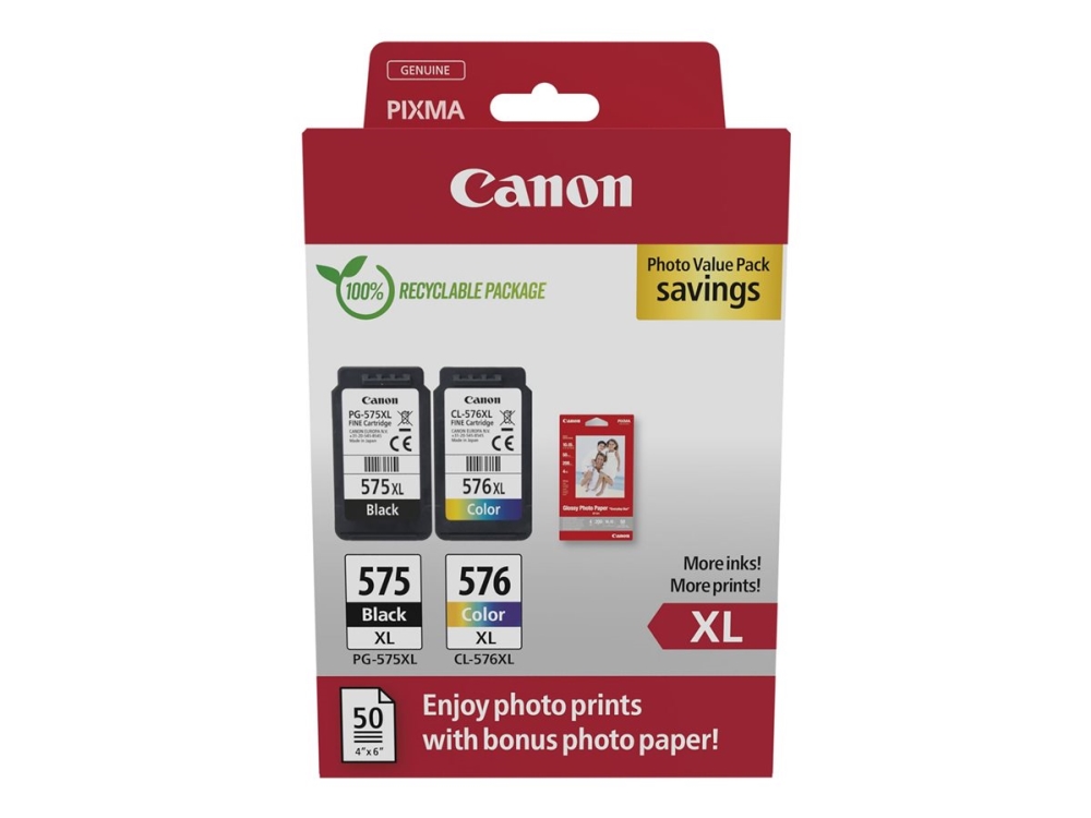 Canon Pg-575Xl/Cl-576Xl Photo Paper Value Pack - 2-Pack - Lång Livslängd - Svart, Färg (Cyan, Magenta, Gul) - Original - Hängande Låda - Bläckpatron/Papperssats - För Pixma Tr4750i, Tr4751i, Tr4755i, Ts3550i, Ts3551i