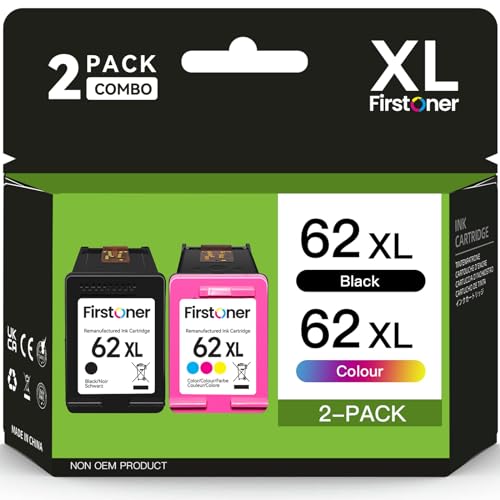 Firstoner 62XL bläckpatron, tvåpack, 62XL svart och färgpatroner Ersättning för 62 Bläckpatroner för Envy 5540 5541 5542 5640 5544 5546 5644 5646 OfficeJet 200 250 5740 5742 5744