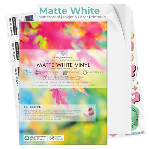 Evergreen Goods Ltd 30 ark A4 vitt självhäftande matt klistermärkes papper | Hållbart fotopapper för bläckstråleskrivare och laserskrivare | papper med klibbig baksida, perfekt för anpassningsbara