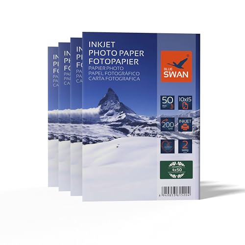 BLUE SWAN Glansigt Fotopapper för Bläckstråleskrivare, 10x15 cm, Dubbelsidig Glansig Yta, 200g/m², Snabbtorkande, Vatten- och Reptålig, Hög Färgklarhet, 200 Ark (4 Paket om 50)