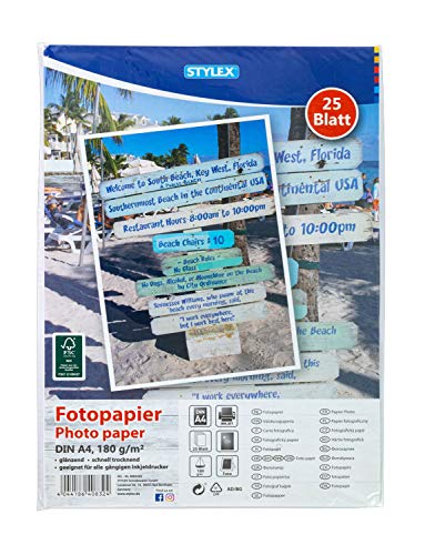 Stylex 40832 – fotopapper, DIN A4, 25 ark, 180 g/m², glänsande, snabbtorkande, passar alla vanliga bläckstråleskrivare
