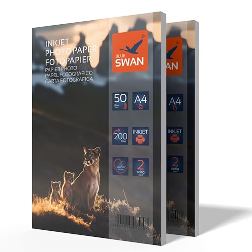 BLUE SWAN A4 fotopapper 200 g/m² 100 ark – Dubbelsidigt högglansigt, vattenavvisande, snabbtorkande & reptåligt – för foton, broschyrer, presentationer & flygblad – kompatibelt med bläckstråleskrivare