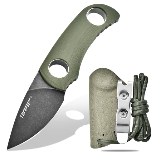 TONIFE 4,7 cm fast bladkniv, minihalskniv med Kydex-fodral och snodd, EDC bärbar fast kniv för överlevnad utomhus (grön + svart titan)