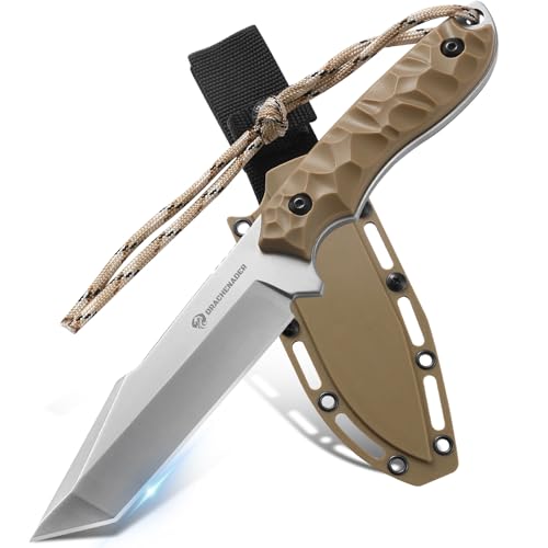 DRACHENADER Tanto B-ER-TANTO Point kniv, Outdoor Survival 13 cm längd fast bladkniv, 5Cr14MoV stålblad för bälte, med lock, silverblad - ABS-handtag kaki