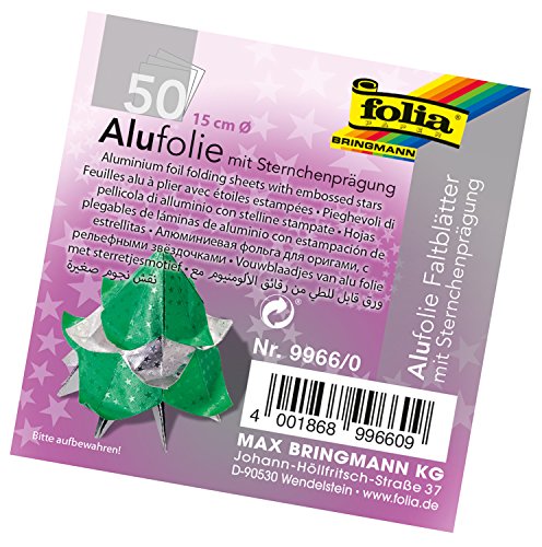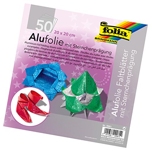 folia 9961 – Fällbara blad av aluminiumfolie med stjärnprägling 20 x 20 cm, 100 g/kvm, 50 ark, blandade färger – perfekt för pappersveck och andra kreativa hantverk