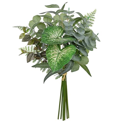 Arborus Konstgjorda grönska eukalyptusstjälkar buketter, 5 olika typer blandade silver dollar ormbunke löv kaladium blad falska växter bulk för gör-det-själv-buketter bröllop blomsterarrangemang bord