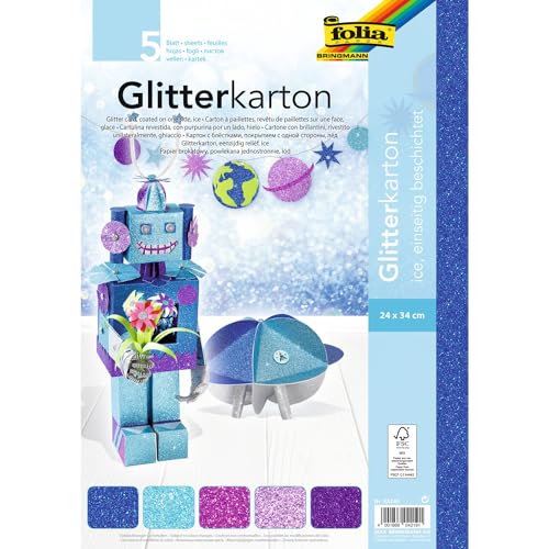 folia 85249 – Glitterkartong Ice, blandade färger, 24 x 34 cm, 5 blad, 300 g/kvm – för eleganta och gnistrande hantverk