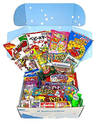 40 x Dagashi sortiment blå Sakura box set japanska sötsaker klubbor godis choklad mellanmål