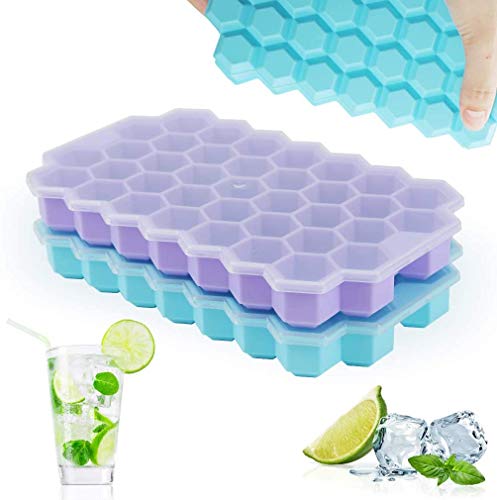Rottay Isbitsform, 37-vägs isbitsform 2-pack silikon isbitsbehållare med lock iskubsbricka, stapelbara isbitsformar för whisky cocktails juice choklad godis (blå + lila)