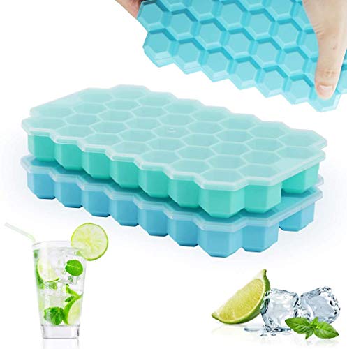 Rottay Iskubsform, 37-vägs iskubsform, 2-pack isbitsbehållare i silikon med lock, isbitsbricka, stapelbara isbitsformar för whiskycocktails, juice, choklad, godis (grön + blå)