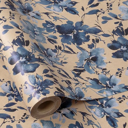 Ruspepa Blått blommigt presentpapper, indigofärgat inslagningspapper, akvarell, blommig kraftpappersrulle, minirulle, för vår och födelsedagar, 43 cm x 10 m