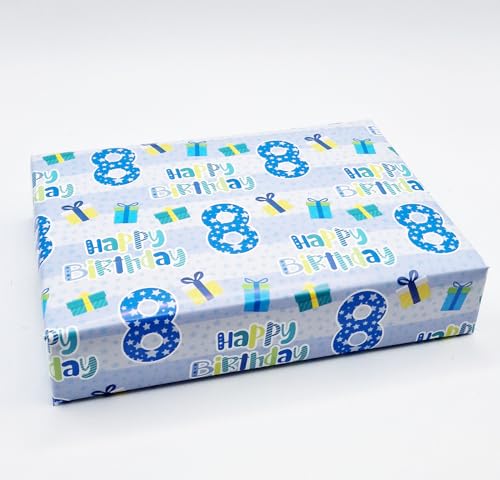 4 ark + 4 presentetiketter 8:e födelsedagen pojke blå omslagspapper ålder 8 söt födelsedag presentpapper blå (PA)