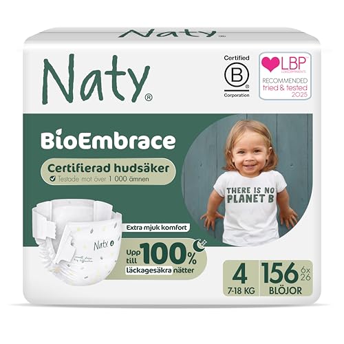 Naty BioEmbrace Blöjor Storlek 4 (7–18 kg) | 100% Biobaserat på Hud | Växtbaserad Mjukhet, Dermatologiskt Testad, Super Absorberande | 156 Stycken