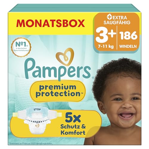 Pampers Premium Protection storlek 3+, 186 blöjor, 7 kg–11 kg, vårt nr 1 hud- och läckageskydd