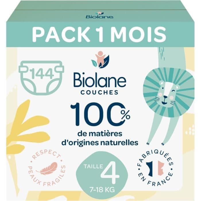 BIOLANE – blöjor storlek 4 – (7 – 18 kg) – för känslig hud – ultraabsorberande, inget läckage, torr 12 timmar – förpackning 1 månad 144 blöjor