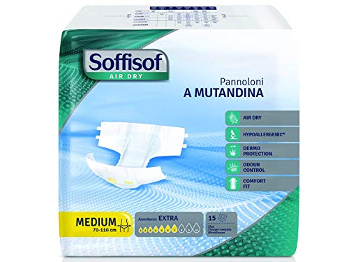 SOFFISOF Air Dry elastiska blöjor för vuxna, medelstorlek, urinkontinens, extra sugkraft, per dag, 6 förpackningar om 15 st.