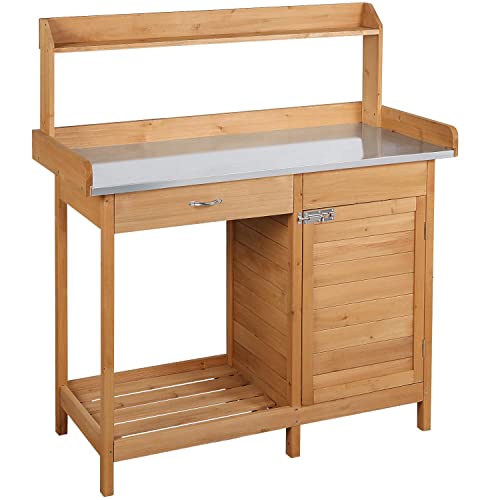 Yaheetech Växtbord med galvaniserad bänkskiva, väderbeständigt trädgårdsbord, blombord, träväxtbord med underskåp, förvaringsyta och låda för trädgården/terrassen/balkongen