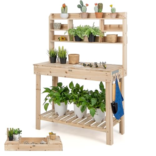 GOPLUS Växtbord av trä, trädgårdsbord med vikbar bordsskiva, trädgårdsbord med hyllor och krokar, blombord för trädgård och balkong, 110 x 50 x 153 cm