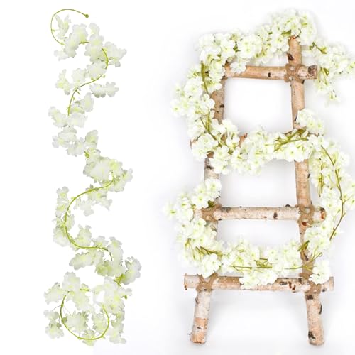 JVBAJV 2 stycken blomgirlang, dekoration för körsbärsblommor, 1,8 m, hängande konstgjorda blommor, 135 blomhuvuden, vita blomgirlang, konstgjorda blommor, hängande för bröllop, fest, hus, trädgård,