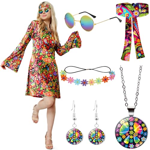 RoserRose 70-tals outfit dam hippie kläder, kostym med klänning, glasögon, hårband, blomgirlang, halsband, örhängen – för karneval, fest, halloween (färgglad A, S)