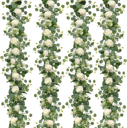 Dremisland 4 stycken konstgjord blomgirlang, vit, eukalyptus, girlang, dekoration, sidenblommor, rosgirlang, konstgjorda blommor, girlang, hängande växt, blomrankor för bröllop, bordsdekoration, fest