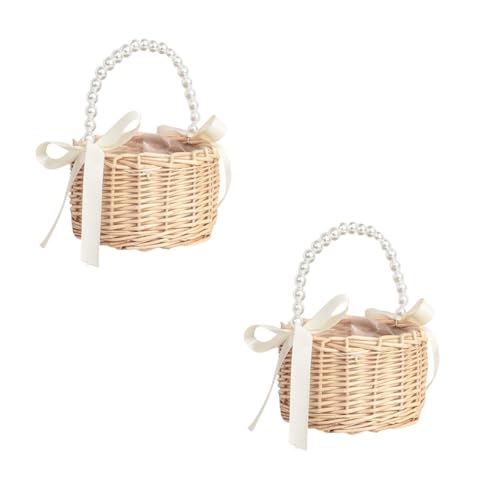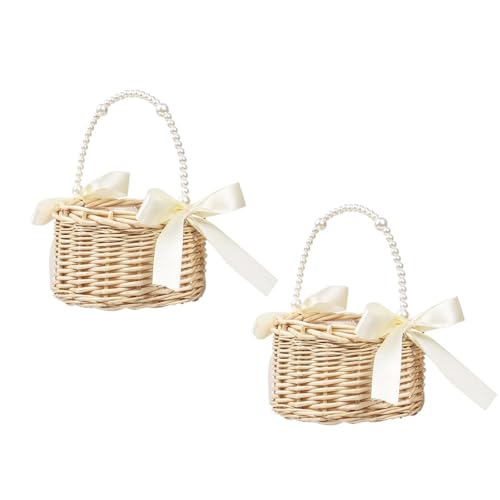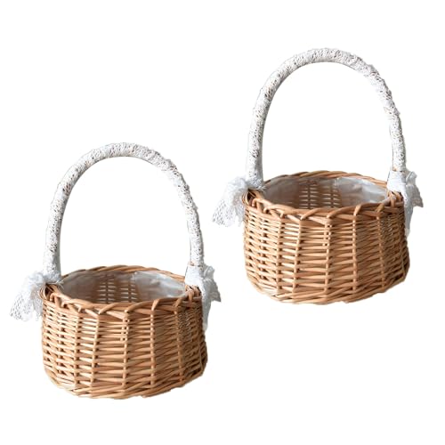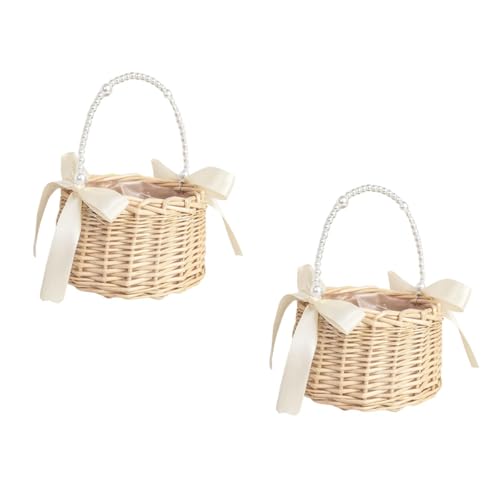 2 st Wicker Rotting Girl Korg, Blomkorg Med Handtag Och Rosett Brud Blomkorgar Wicker Korg för Bröllop (A)