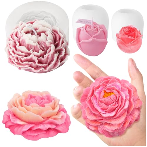Asaisimg Set med 3 st pionblommor silikon ljusformer, 3D-pion och rosa silikonharts tvålformer, blomma fondant silikonform för handgjord tårtdekoration choklad epoxi gjutning harts hantverk