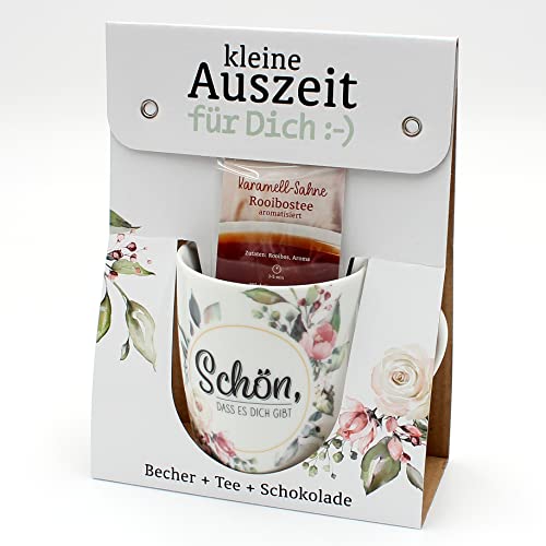 Presentset – liten paus – te, – kaffekopp/kopp av porslin + te + choklad, motiv: Vackert att det finns dig/blommor, storlek H/Ø: 9,8 x 8,2 cm, kapacitet 250 ml, diskmaskinssäker.