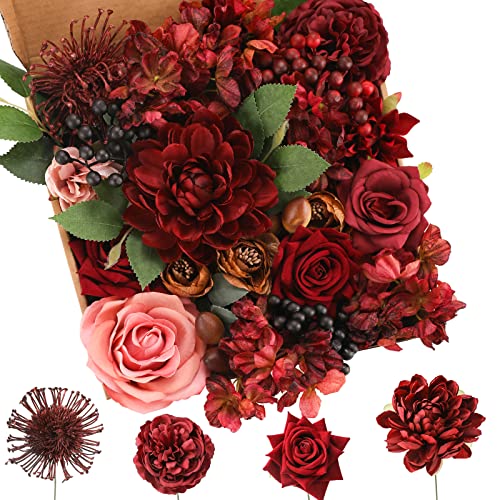 Floweroyal konstgjorda blommor kombo vinröda blommor mix sidenblommor dahlia-rosor med stjälkar för gör-det-själv bröllop brudbuketter, baby shower, blomsterarrangemang, bordsuppsatser, heminredning