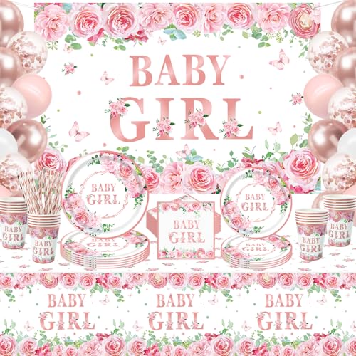 167 st babyshower dekorationer flicka kön avslöja festtillbehör babygirl servis set – tallrik, servetter, baby shower bakgrund, ballonger roséguld blommig flicka baby shower festdekorationer serverar