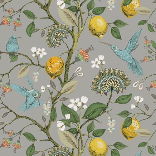 VaryPaper Blå fågel självhäftande vintage blommig tapet 44,5 cm x 300 cm klibbig baksida plast grå vinylwrap för möbler, sovrum, vardagsrum, skåp, bakgrund