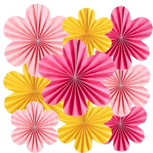 SUNBEAUTY 9 st pappersblommor dekorationer rosa gul papper fläktar för vägg blommig bakgrund dekoration hängande rosa fans blomma för klassrum födelsedag vägg baby shower vår te party decr