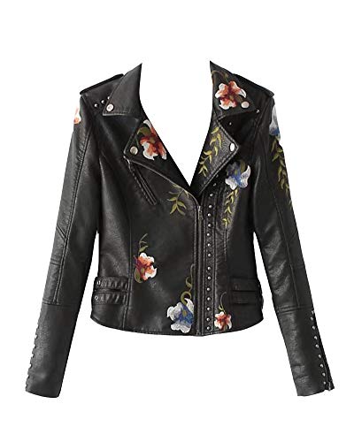 GuoCu Kvinnors blommiga broderade fuskläder motorcykel jacka blazer rockar, Svart, M