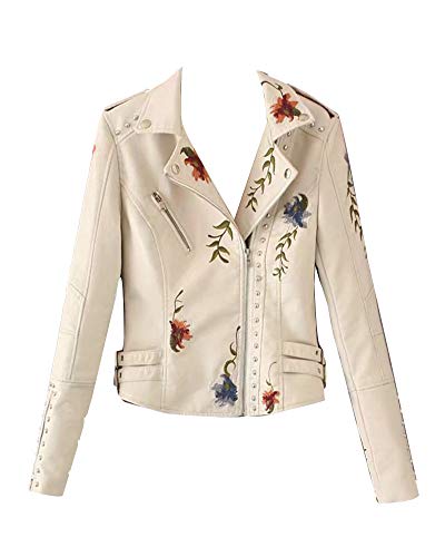 GuoCu Dam PU-läderjacka konstläderjacka med broderi blommig bikerjacka kort jacka övergångsjacka ytterkläder rockar, Beige, S