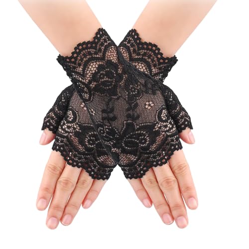Lufdegim dam spetshandskar fingerlösa handskar spetshandskar kort te party halloween fingerlösa blommiga handskar bröllop opera dans cosplay kostym tillbehör elegant, svart, 15cm