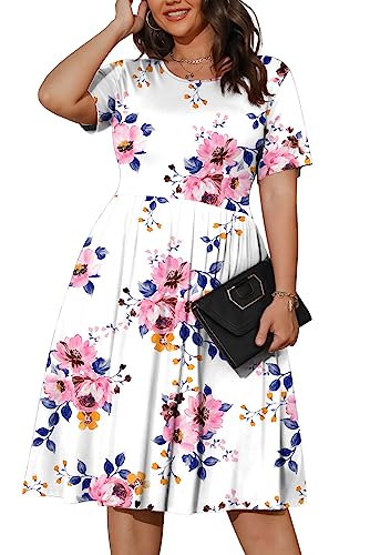 POSESHE Avslappnad kortärmad sommarklänning för kvinnor, plusstorlek, empirestorlek, lös passform, med fickor, Blommig vit, 3XL stor