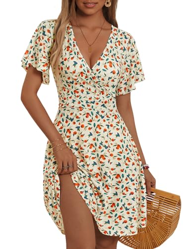 FENSACE sommarklänning för kvinnor – blommig, kortärmad, omslagande med V-hals, A-linje midiklänning, S