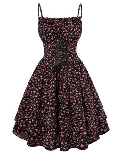 EFOGEP Blommig korsettklänning för kvinnor, bohemisk sommarklänning med smala band, fyrkantig urringning, midilängd, vardaglig, slits, bustierklänningar, XS