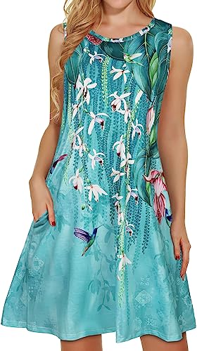Enmain Dam sommarklänning spagettiremklänningar avslappnad knälång gunga blommig v-hals ärmlös klänning med fickor för strand Hawaii S-2XL, Aqua, S