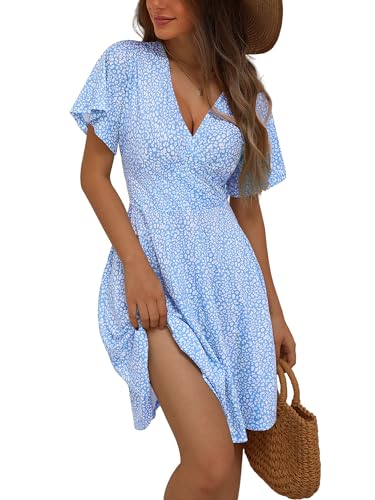 FENSACE sommarklänning för kvinnor – blommig, kortärmad, omslagande med V-hals, A-linje midiklänning, BLÅ, L