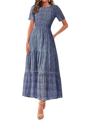 Styleword Sommarklänning för kvinnor, kortärmade blommiga knälånga klänningar med fickor, Blå, M