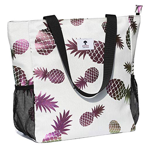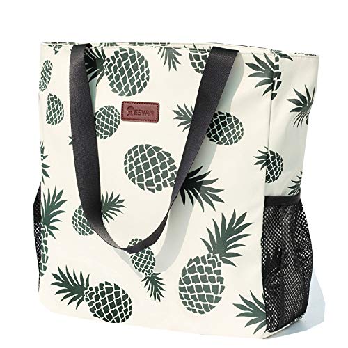ESVAN Original blommig vattentålig stor tygväska axelväska för gym strand resor dagliga väskor uppgraderade, Vit ananas-uk, Large