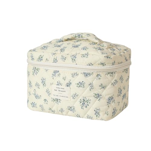 uekeboag Stor quiltad sminkväska för kvinnor, blommig bomull kosmetisk väska, kokett estetisk blommig necessär organiseringsväska, 01lithtblå-blomma, Bomull med blommönster