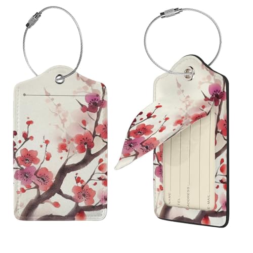 Japanska vårplommon blommiga bagagetaggar för resväskor, PU-läder resetaggar med full rygg integritetsnamn ID-kort, personliga namnetiketter för väskor, etiketter för resväskor med metallögla, svart