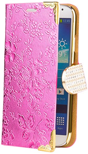 iCues Samsung Galaxy S4 | krom blommor väska rosa | [display skyddsfilm ingår] blommig strass glitter lyx bling kvinnor kvinnor flickor krome bok hopfällbart skal skydd fodral mobilväska att fälla upp