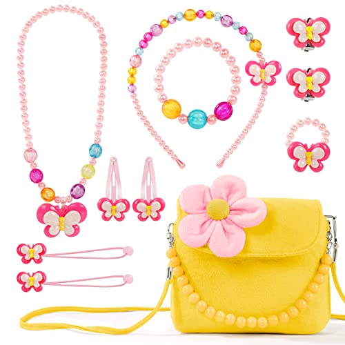 OSDUE väska och smyckespresenter, blommiga axelväskor och smyckesset, blommiga prinsesshalsband, armband, ringar, örhängen, prinsessmyckensaccessoarer, festpresenter
