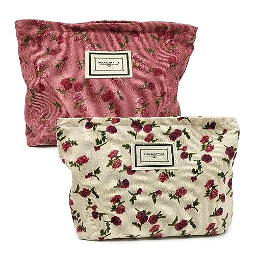 SKHAOVS 2-pack sminkväska i duk, blommig sminkväska, rosa blommor tryck manchesternecessär, bärbar kosmetisk väska, resesminkväskor, toalettförvaring, för kvinnor flickor, 2 Färg, En storlek