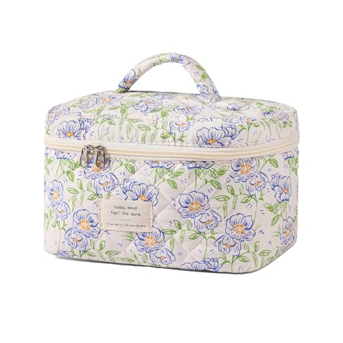 uekeboag Stor quiltad sminkväska för kvinnor, blommig bomull kosmetisk väska, kokett estetisk blommig necessär organiseringsväska, 02blå-blomma, Blommig bomull