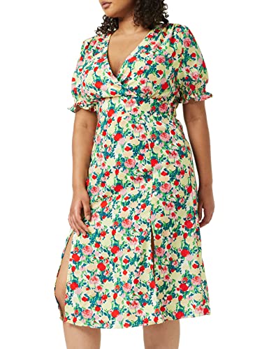 kissmay plusstorlek dam V-hals blommig cocktailparty midi-klänningar med ficka, Gul/Vit, 50-stor