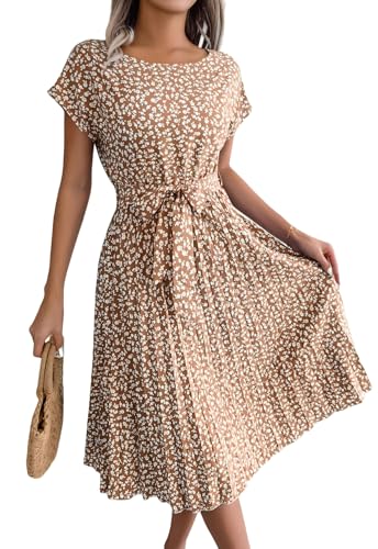 Blommig midi-klänning för kvinnor med knytmidja och veckad kjol, kortärmad rund hals, ledig, elegant, vardagskläder, Kaffe, S